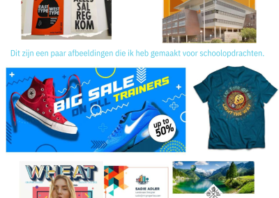 Bij deze projecten nam ik regelmatig het voortouw in het creatieve proces. Ik was verantwoordelijk voor het ontwerpen van logo’s, wireframes, moodboards, posters, digitale presentaties en meer. Door deze ervaringen heb ik mijn eigen stijl kunnen ontwikkelen en mijn technische vaardigheden verder verfijnd.